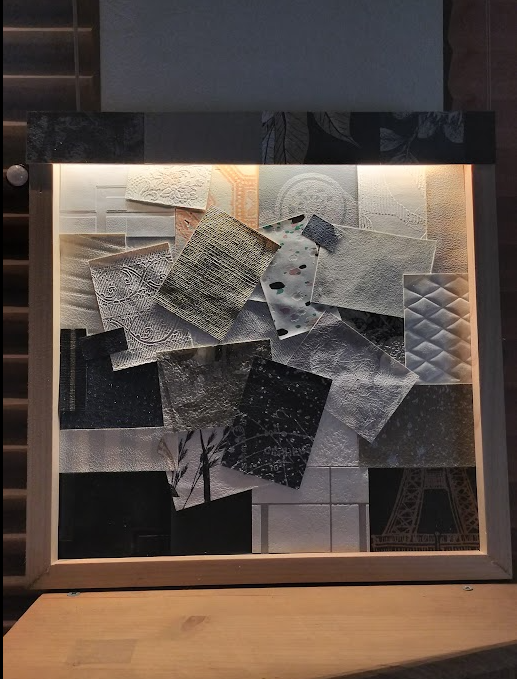 次に、剥がした壁紙をパネルに貼る準備作業。色、形を決めてパネルに仮置きします。